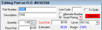 A Tire Info button appears on the Editing Part Window if the part is part of a tire group. It appears red if the DOT number is required is required before you can finalize the repair order.