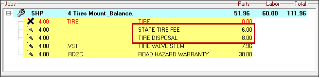 Most tires are added using Tire Quote, which means that tires are added with the pricing package selected in Tire Quote. Pricing packages include the labor operation (including the time and the rate) and the additional parts from the associated parts kit.