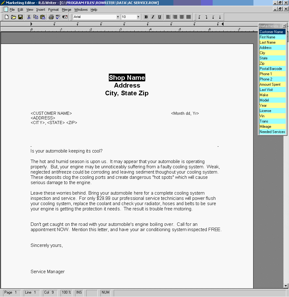 To change a word in an existing document, select the word by placing the insertion point at the beginning of the word (move the cursor to the beginning of the word and click), and select the word (click and hold the left mouse button, drag the cursor across the word, and release the left mouse button at the end of the word). Selected items are highlighted. In our example, to change the words ”Shop Name” to the real name of the shop, just start typing. What is being typed will replace the selected text.