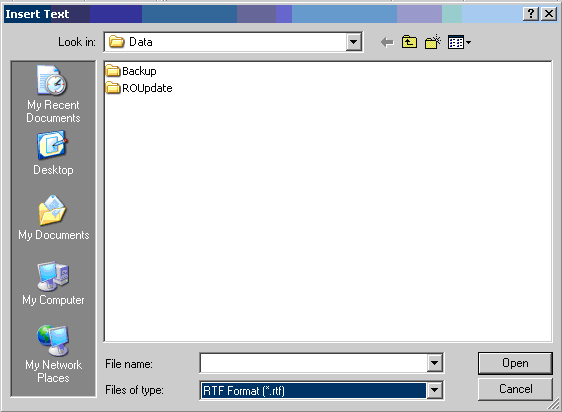 In order to insert, or open a file, the user must first be able to locate it. For files relating to R.O. Writer, I would recommend that they be saved in the Data directory (See Data Locations) to simplify searching. In any case it is important to know how to navigate the file structure of your computer.
