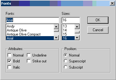 Using the toolbar, the font, size, and the attributes bold, italic, and underline may be changed for any selected text. Selecting Format, Character, or Format, Text Color from the menu will also modify text. I recommend not changing the text color, unless there is a color printer available for printing. Colors, especially light ones, do not print well on a black and white printer. Also a word of caution about colors: do not select the same color for the text and the background. White on white, black on black, or any color on itself makes the text invisible.