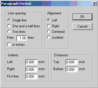 Each time the Enter key is pressed a new paragraph will begin. The new paragraph will begin one line beneath the previous paragraph by default. To specify a distance in inches from the previous paragraph and the next paragraph, enter the amount to be spaced from the top and the bottom in the Distances section. The spacing entered here is added to the line spacing.