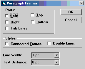 Paragraph frames provide a means of drawing a border around all of the text in a paragraph. This capability can be used to highlight text, perhaps the shop’s name, or can be used to draw a table using tabs. Different line widths may be used to change the effects of the border, and text may be indented from the edge of the lines.
