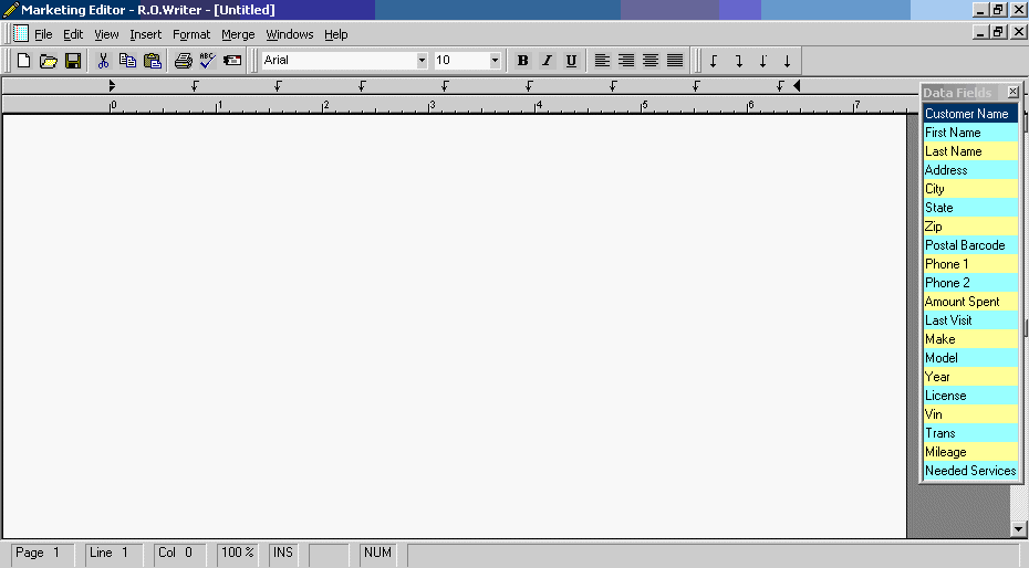 The Marketing module includes an editor, or word processor, that provides a means to modify the existing follow-up and marketing letters to meet the needs of the shop, and it also gives the capability of creating new letters as desired. The functionality of this simple, third party word processor is similar to that of Microsoft Word. Anyone that has used MS Word before should be very comfortable using this product. For those that have not used a word processor before, or feel that they may need guidance, this section will provide some instructions on how to use the word processor.
