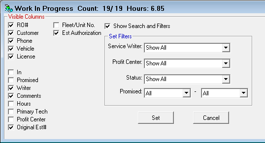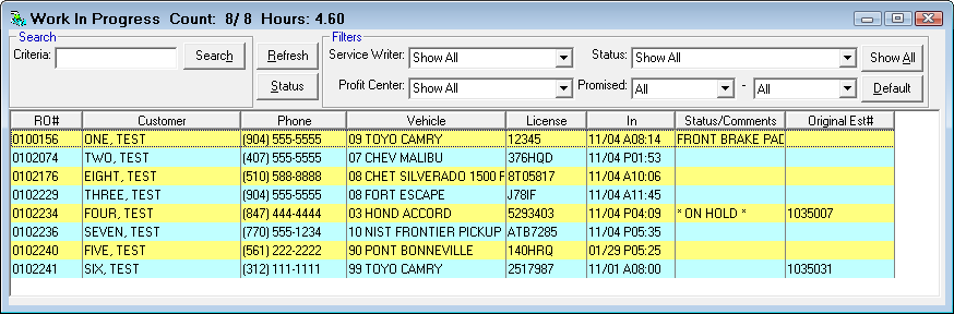The WIP window is open by default when you first open R.O. Writer. If you don't see it, click the WIP (Z) button on the main toolbar . All active repair orders display on this window; repair orders with a Status of Closed and Void do not appear on the WIP window.